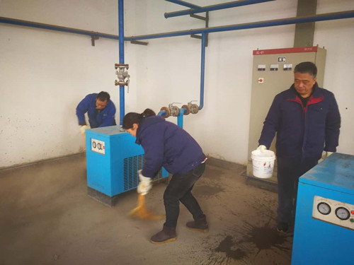 根據整改要求,再制造黨支部立即組織全體黨員開展“沖在前,有行動”主題黨日活動,面對厚厚的灰塵、堆放的雜物,黨員們毫不猶豫地投入到現場的清理、清掃工作之中。灑水的、清理地面塵土、雜物的、擦拭設備及管道的大家分工協作,爭先恐后,沒有人面對滿屋彌漫的灰塵而退縮,經過近一個小時的努力,每個人的衣服,頭發上都落滿了灰塵,但看到原本臟亂的空壓機房變得干凈整潔了,大家都露出了滿意的笑容。
