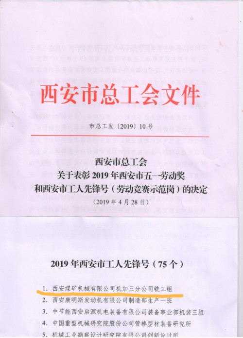 在剛剛閉幕的西安市2019年慶祝"五一"國際勞動節暨表彰大會上傳來捷報,公司機加三分公司銑工組喜獲″西安市工人先鋒號″稱號。
