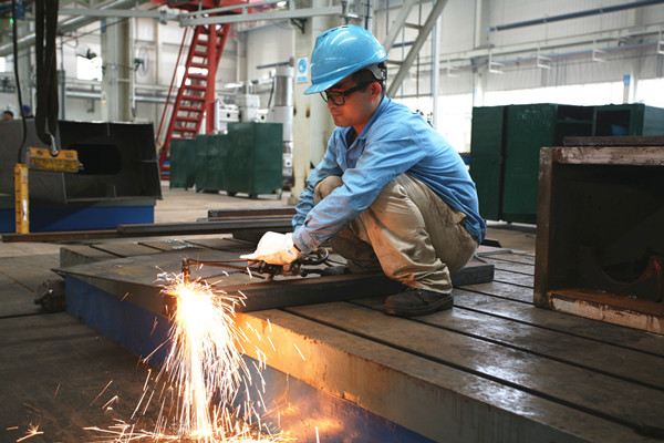 走進(jìn)金屬結(jié)構(gòu)分公司車間,最東邊的數(shù)控等離子切割機(jī)正裁剪著所需的各種不同厚度的毛坯件,散發(fā)出1000℃以上的高溫,等離子切割鋼板時(shí)強(qiáng)烈的弧光激起陣陣火花,考驗(yàn)著切割工人師傅的身體。為確保中鐵武研院MDEL200搬運(yùn)機(jī)的各個(gè)部分的下料如期完成,搶回因設(shè)備停機(jī)影響的三天時(shí)間。分公司數(shù)控班組組長胡建勤克服人手少、任務(wù)重、工期短的困難,主動(dòng)安排兩班作業(yè),保證下料切割工作首當(dāng)其沖。白班從早上開始數(shù)控操作,中午機(jī)器不停大家輪流吃飯,數(shù)控機(jī)床的高溫,使得小伙子們顧不上剛下完料的毛坯高溫煎烤,盡快將鐵塊擺放整齊。而晚班的工人,紅腫著雙眼干到凌晨近3點(diǎn),才拖著疲憊的身軀回家。當(dāng)問他們天天這樣加班能否吃得消時(shí),大家只是靦腆的一笑說“沒問題,扛得住!”
