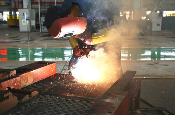 在鉚焊一組,組長馬峰正在專心焊接門架支腿上方的殼體,小管內(nèi)壁焊機(jī)噴出長長的火焰。他們班組干的雖然是小件產(chǎn)品,但責(zé)任一樣重大,手把焊接是個(gè)細(xì)活兒,既需要熟悉圖紙工藝和技術(shù)要求,又要有堅(jiān)韌剛強(qiáng)的意志。他干起活來專心致志,高溫下汗水順著額頭流淌了下來,他都顧不上擦拭,彰顯了一個(gè)鉚焊工精益求精的工作態(tài)度。