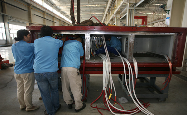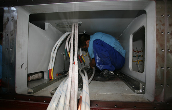 面對困難和挑戰,電氣分公司員工迎難而上,組長景海濤身先士卒,在沒有現成經驗可循的情況下,積極克服各種困難,加班加點,邊學習、邊摸索、邊實踐,與公司技術部門人員一起想辦法、拿方案、攻難關。特別是在布置電控箱主電纜鋪設過程中,面對電控箱箱體入深尺寸僅一米多的狹窄空間,為達到工藝技術要求,員工陳龍龍整個人身體蜷縮于電控箱內安裝布線,一干至少40分鐘,歇口氣就又鉆進去接著干。正常情況下,在室外開闊區域雙手凌空布線,一般人堅持40分鐘以上也會手困、眼花、脖酸,更何況他們是在狹窄的空間布線,其難度和體力消耗可想而知。